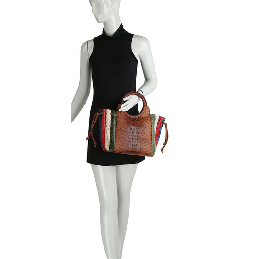 OSTRICH CROC PATCHWORK STRIPE 2-IN-1 SATCHEL~BLACK